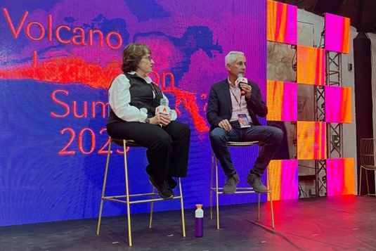 Michelle Lane Messina y Fernando Paiz durante su charla en el Volcano Innovation Summit 2023. Foto: UVG.